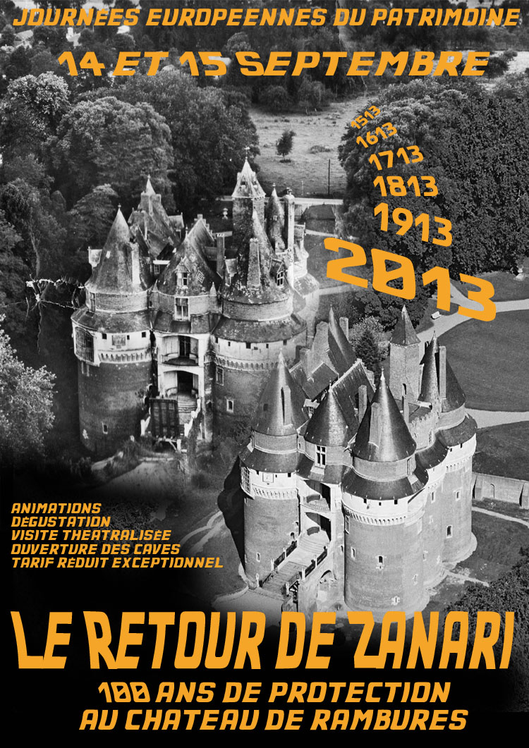 Promenade en calèche dans le parc à l'anglaise. "Conférence-promenade" de Monsieur Jean Baboux dans les jardins : William Henry White, architecte anglais du Château de Bizy. Samedi 14 à 15h et dimanche 15 à 10h30. Les visites guidées de l'intérieur du château auront lieu toutes les demi-heures de 10h à 17h. Tarifs : Visite guidée du château et visite libre des jardins inclus : tarif exceptionnel de 5€ par personne et gratuit pour les moins de 18 ans. Visite libre des jardins uniquement : 4€ et gratuit pour les moins de 18 ans. Conférence-promenade : 4€ et gratuit pour les moins de 18 ans Promenade en calèche : 3€ Château Fort de Rambures, son Parc et sa Roseraiedu 14 septembre 2013 au 15 septembre 2013le retour de Zanari pour les journĂ©es du patrimoine